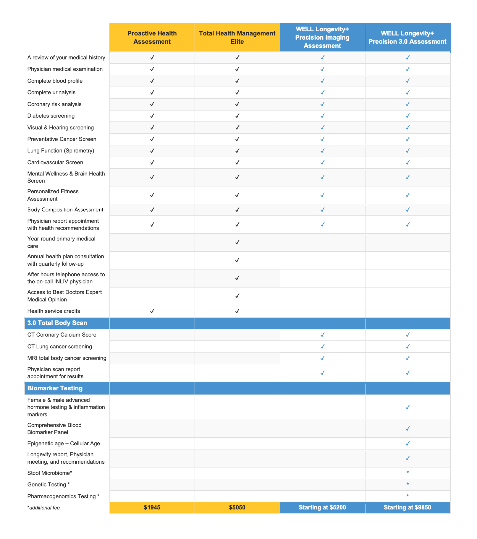 Our assessment services offer both our base executive assessment, our executive assessment with advanced imaging, and our Longevity Medical Assessment which provides a new level of insight. No matter which service you choose, we offer personalized and actionable health insights that empower you to be proactive about your health.